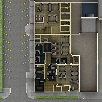 Aerial floor plan rendering showing